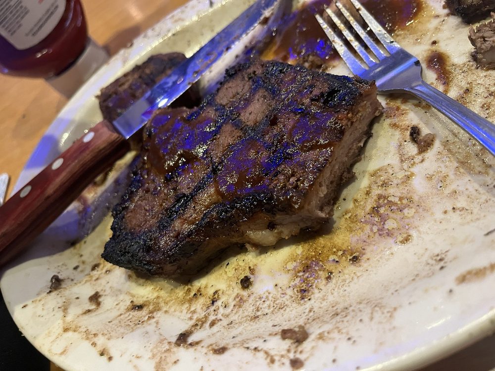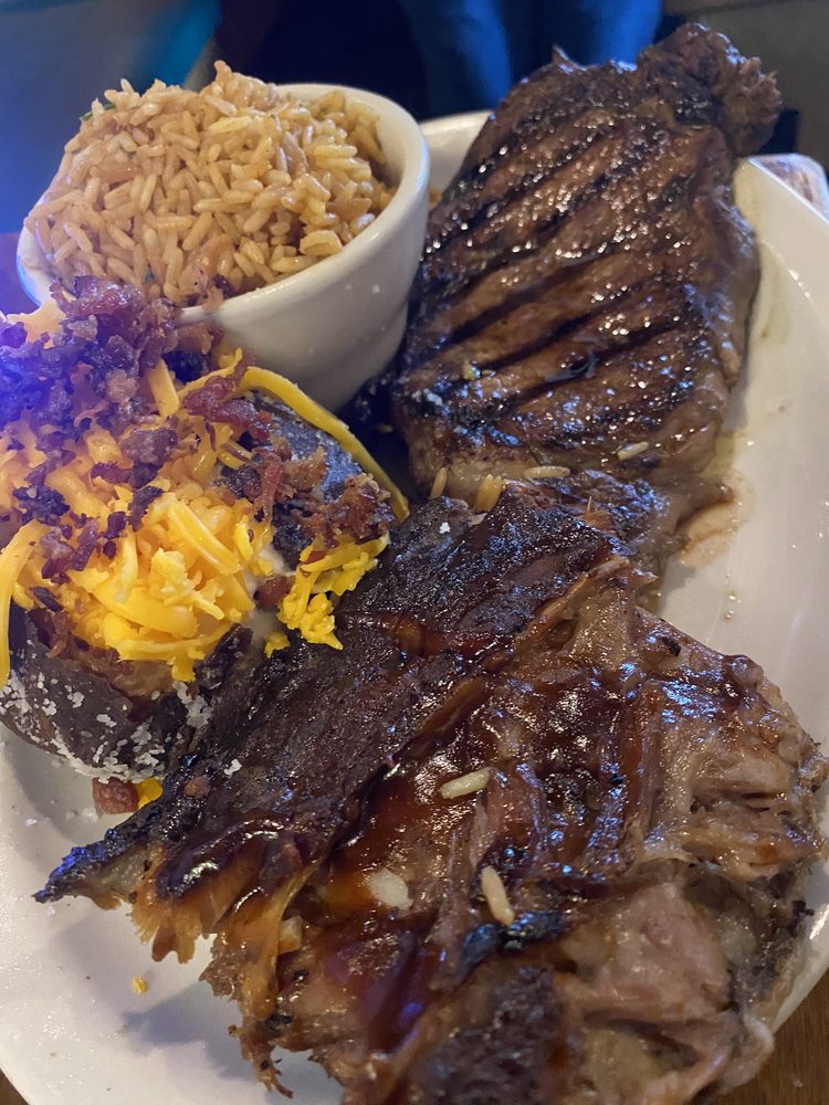 Very juicy and flavorful from the marbling throughout the steak along with slow cooked ribs in a unique blend of seasonings and our signature BBQ sauce