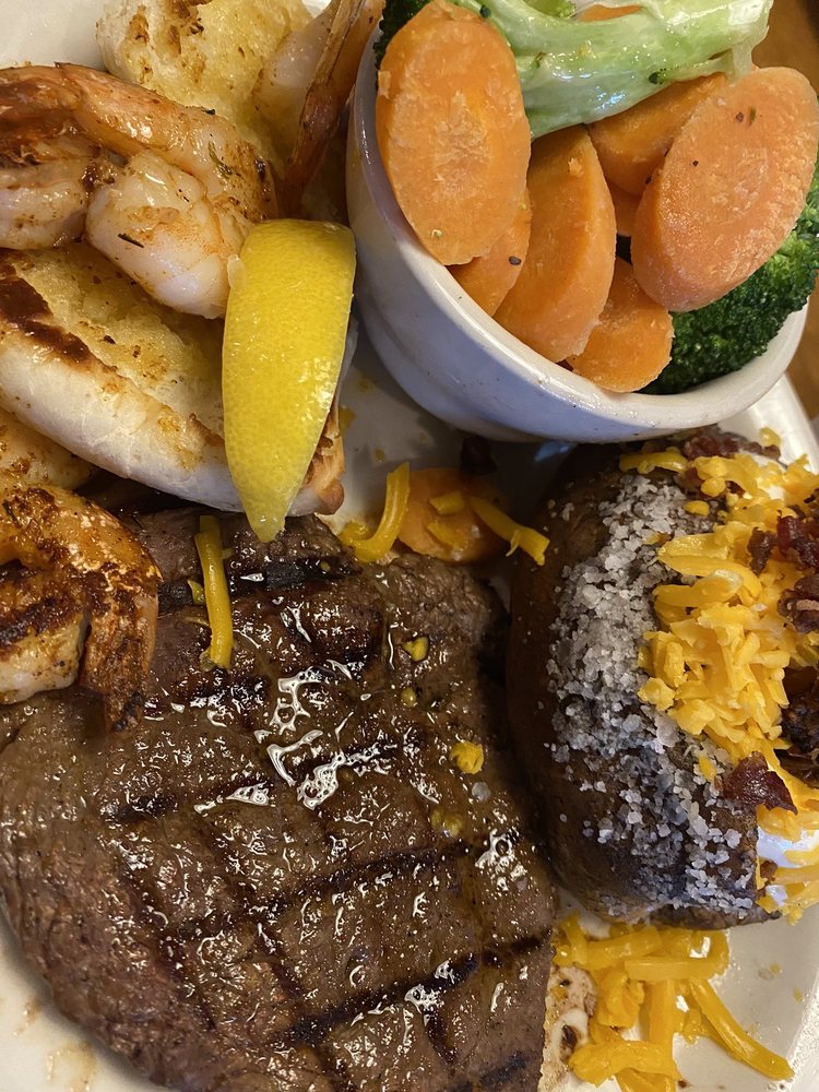 Very juicy and flavorful from the marbling throughout the steak along with large shrimp seasoned, grilled, drizzled with garlic lemon pepper butter