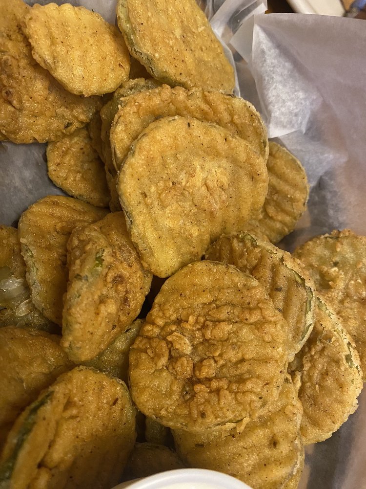 Shareable basket of golden-fried pickle chips served with Ranch or Cajun sauce for dipping
